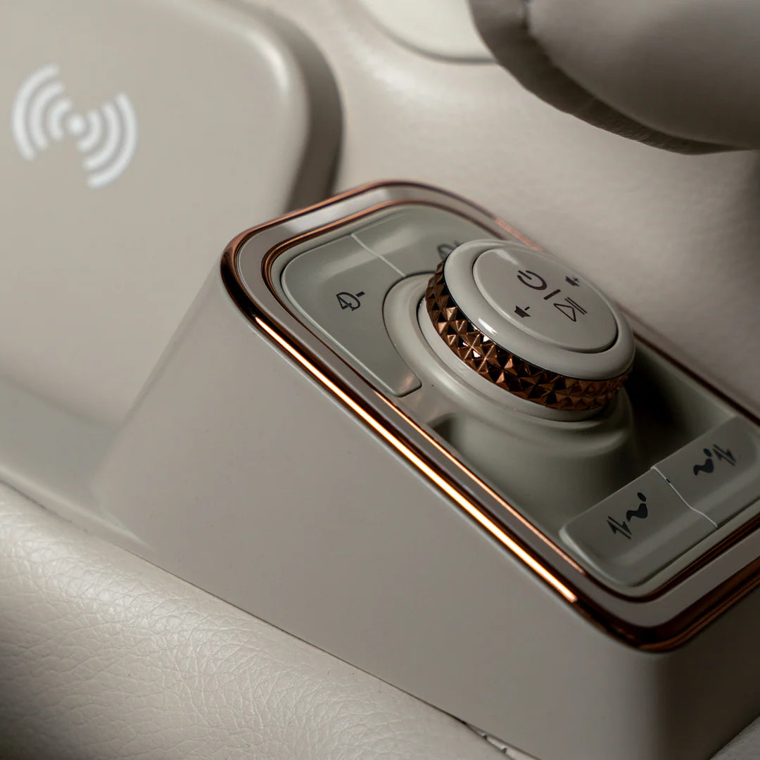 Our innovative design features an on-board wireless contact charging pad seamlessly embedded into the armrest, ensuring your phone stays powered up effortlessly while you relax.